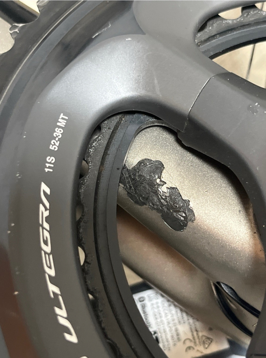 안녕하세요. 체인이탈 충격으로 인하여, 카본층이 깎여나가면서 미세크랙이 발생된 모습이네요. 튼튼하고 퀄리트 높게 수리복원가능합니다. 상세한 내용과 견적등은 전화통화로 안내해드렸습니다. 더 문의하실 내용이 있으면 언제든지 전화나 카톡 또는 문의글 남겨주세요. 감사합니다.